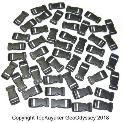 Standard one inch wide, side release buckles commonly found on outdoor accessories. The male side of the buckle has an adjustable ladder-loc, the female side does not have a ladder-loc. The female side is typically secured with a 1 inch tri-glide (NOT included). Alternatively the female half can be sewn onto a strap. Sold as 50 complete buckle sets (male and female parts). 1WEB