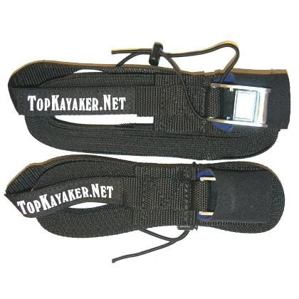 Heavy duty webbing straps with padded metal cam-lock buckles. Bungee tie secures excess strap! Use one pair per kayak as roof rack tie downs for car topping your kayak(s). Can also be used as bow and stern tie downs. Link together to make extra long straps. For use on sports racks, luggage racks, foam racks, pick-up truck racks and trailers. Sold as pairs.