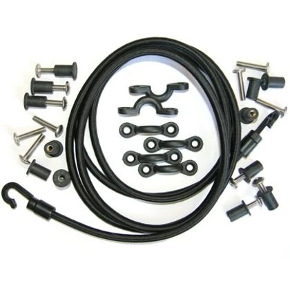 Best used as the Deck Net for the bow of a sit-on-top kayak but can be handy for a variety of purposes. It is the perfect place to park your paddle when you need your hands free for getting onto or off of your kayak. Useful for fishing, diving and sailing as well as small cargo. Can also be utilized as tank well or cargo well tie downs, with the addition of a pair of brass clips. Kit contains 5.5 feet of shock cord, 2 plastic hooks, 6 strap eyes and 12 wellnuts. Assembled in USA.