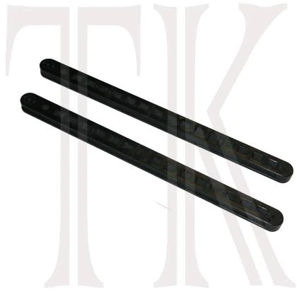 Rails are plastic, 15 5/8 inches long. Bolt holtes are 14 5/8 inches on center, with two more additional bolt holes 8 5/8 inches on center. SOLD IN PAIRS. Old style Keepers rails and tracks are not compatible with new style Keepers rails and tracks. If you do not need old style rails you are better served by geting Keepers Foot Brace Rail. NESC CRCK ERBA KEX