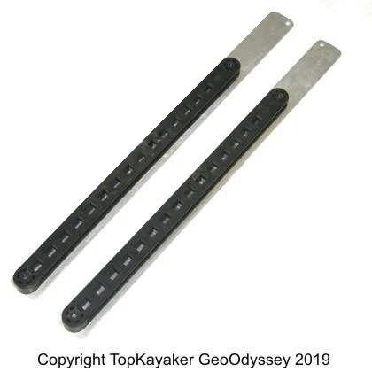 Classic Necky Rudder Rails in very good condition. These are probably new parts, but very old stock, as such we will call them Salvage Parts. This set is fully compatible with the Keepers Foot Pegs and the Necky Foot Control Tracks (these parts are not included). This set could be used as Classic Keepers Foot Brace Rails by removing the metal plates.