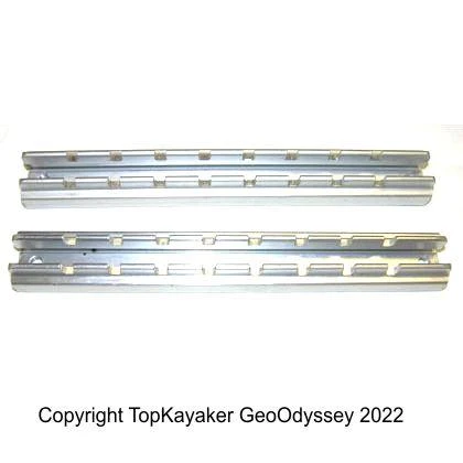 Also know as the Yakima Werner foot brace system, common on white water and sea kayaks. Might be used for some other applications. Made of aluminum with two boltholes, approximately 7 inches on center. Rails are approximately 7.5 in. overall length. 8-9 adjustment settings, slotted bottom. Tapped for 1/4-20 Screws. Left and right are the same. Sold in Pairs. Mohawk Canoe