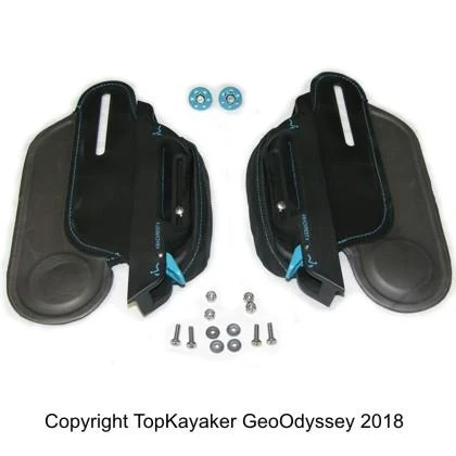 Necky ACS 2.0 Seat Ratchet Set. For use with narrow ACS 2.0 seats outfitted with with 3/4 inch wide ratchet straps. Mated Pairs, left and right thighbraces, each with a seat strap adjustment ratchet. Each Ratchet assembly is 9 5/8 inches long, 1.25 inches wide on the screw side. Complete set; Right Ratchet 07.2000.0828 and Left Ratchet 07.2000.0827 both with thigh brace pads. Secures to the cockpit coaming with enclosed mounting hardware screws, washers and nuts. No Instructions.