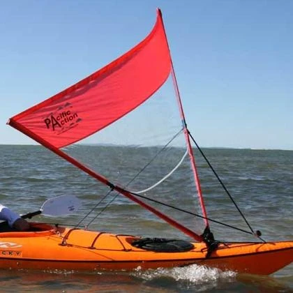 Pacific Action sails can be set for running across the wind (reaching) and going to windward. Change the sail from a downwind Vee rig, to a reaching foil shape in seconds. Pacific Action sails rig to most sit-in sea kayaks, sit-on-top kayaks, folding kayaks and canoes. Sails can be mounted on the foredeck, or suspended between the sides of the boat if there is no deck. Rudders are optional and extend the versatility of the sail, letting the boat point higher to the wind. The Pacific Action Kayak Sail 1 square meter (models 10CI, 10CO, SI10, SO10 and S10CR) is the largest sail allowed for WaterTribe Class 1 rules.