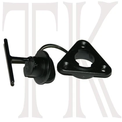 Replacement drain plug for Prijon kayaks (imported from Germany). This is a completely unique drain plug and base. The identification features are the 3 screw base plate and the key-hole shape opening. The base plate and plug are molded as one piece with a tendril of plastic acting as retainer. While it would be possible to clip the new plug from the new base and insert into the old base, it is wise to remove the old base and replace the entire unit (seal new base with silicone). There is a tiny hole on the plug grip that can be used to tie the plug with a cord, as an alternative retainer. Base plate screws are 1 3/16 inch on center.