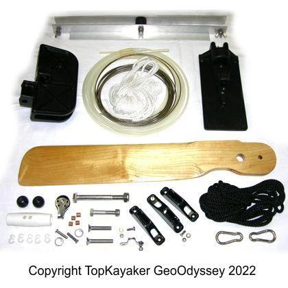 Kit comes with a 19 inch long wooden rudder blade, a rudder plate, a rudder block, internal fixing block, foot control tiller bar, cables, tubes, ropes, cleats, a pulley + assorted fittings and hardware.